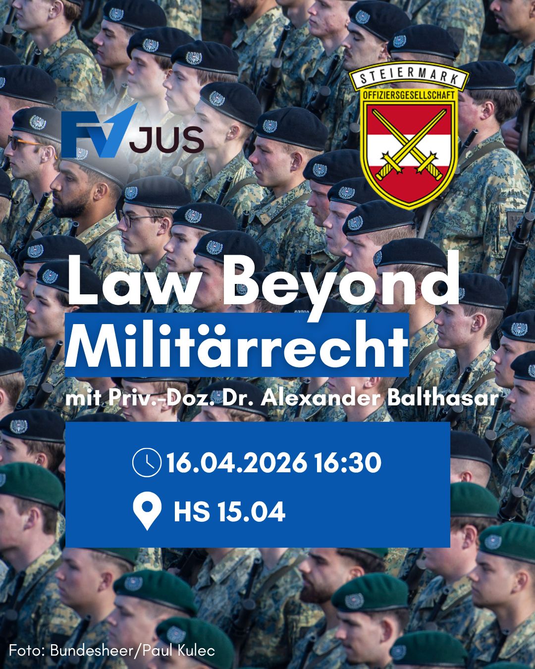 Vortragender: Gast Priv. Doz. Dr. Alexander BALTHASAR, Leiter des Institutes für Staats- und Militärrecht an der Landesverteidigungsakademie des ÖBH. Er gibt uns spannende Einblicke in die Querschnittsmaterie zwischen Recht und Militär.